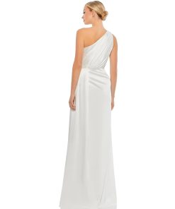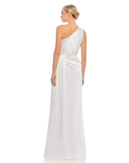 Pleats, draping, a daring slit — this beautiful, bold gown has it all. You can’t go wrong with this glamorous one-shoulder style made from luminous satin. The solid hue directs focus to the detail which adds texture and elegance to the asymmetrical shape. A sweep train finish makes it a perfect candidate for a white-tie or black-tie event.