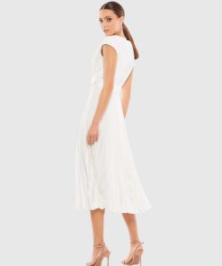 Stunning fully-pleated satin cap sleeve midi dress, designed with a flattering plunging V-neckline and a flowing pleated tea-length skirt. The dress is cinched at the waist with a non-removable belt featuring a chic gold metal buckle. Perfect for weddings, cocktail parties, or any formal occasion, this midi dress offers a sophisticated and stylish look.