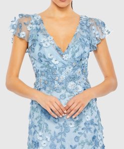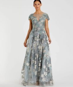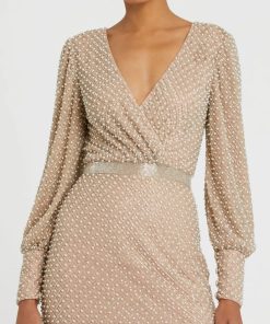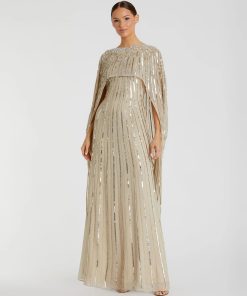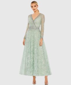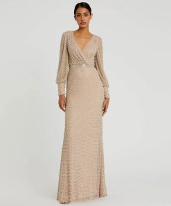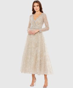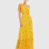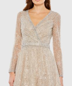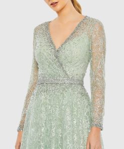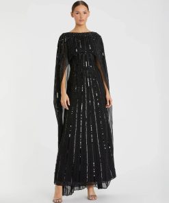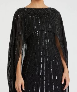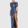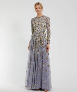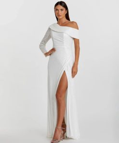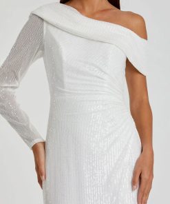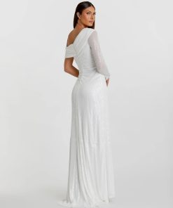 This sleek sequin gown features a drop shoulder design, a single long sleeve, and a daring thigh-high slit, offering a bold and elegant look for any special occasion.