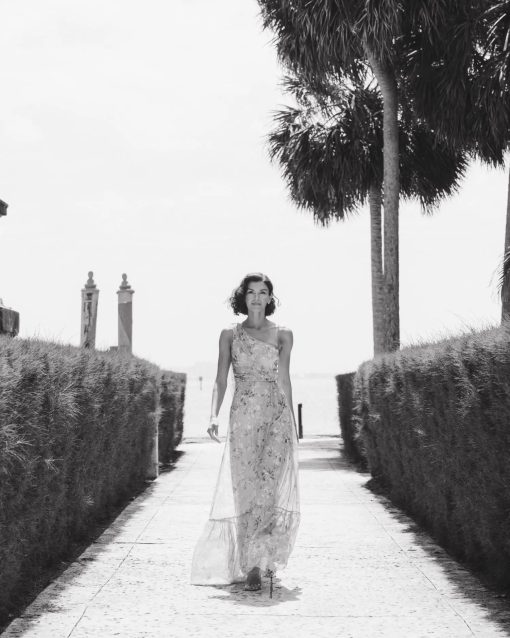 Vibrant floral maxi dress with one-shoulder bow detailing and a flowy tiered skirt.