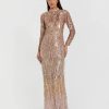 Mac Duggal Women’s Wedding Blue And Gold Long Sleeve Embellished Illusion Evening Gown | Blue